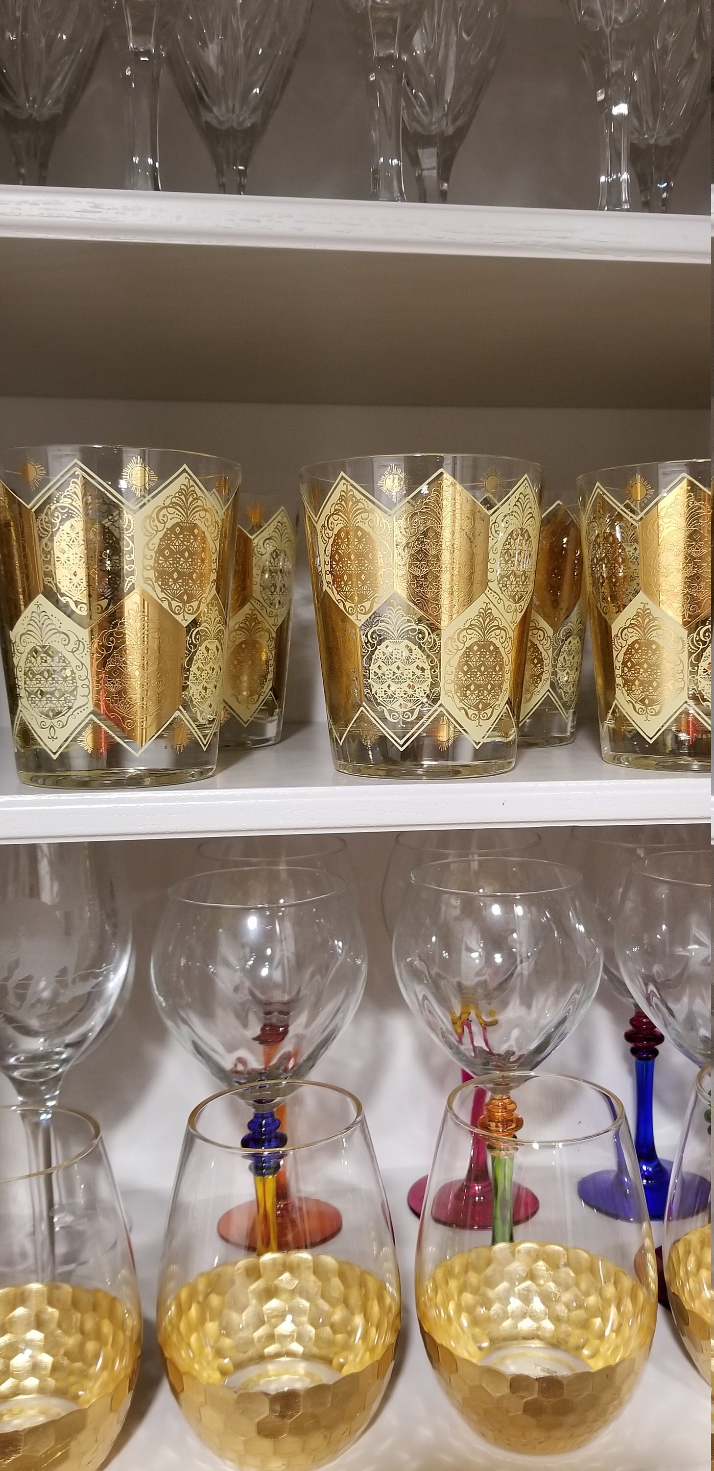 These glasses are so Beautiful!! The gold pineapple motif is so bright and whimsical. They are in almost perfect condition. You would have to hunt for imperfections to find any. I could not stop smiling when I opened them. They look fantastic in my glass cabinet and I cant wait to serve my husband his favorite whiskey in them. They were a great find!